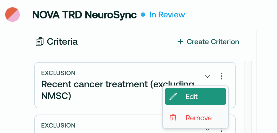 Or, imagine we’d like to edit a criteria. BMI can change, so we may want to loosen this, knowing we can get an exact measurement at the screening visit: