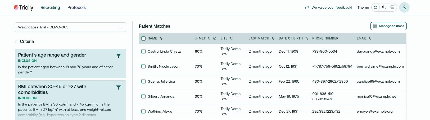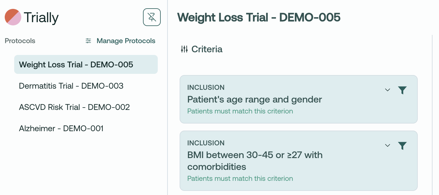 The Protocol Review feature allows clinical research staff to review, edit, and add trial criteria before patient matching begins.