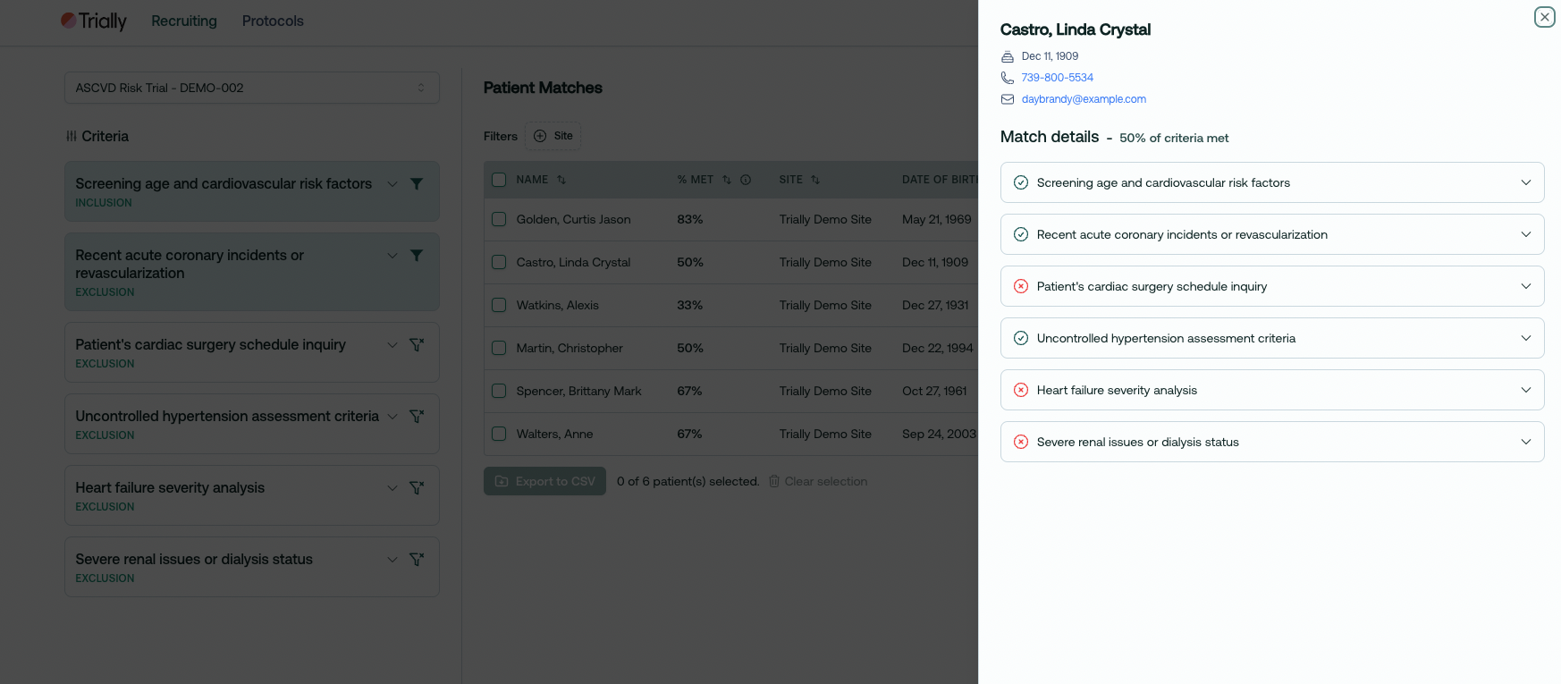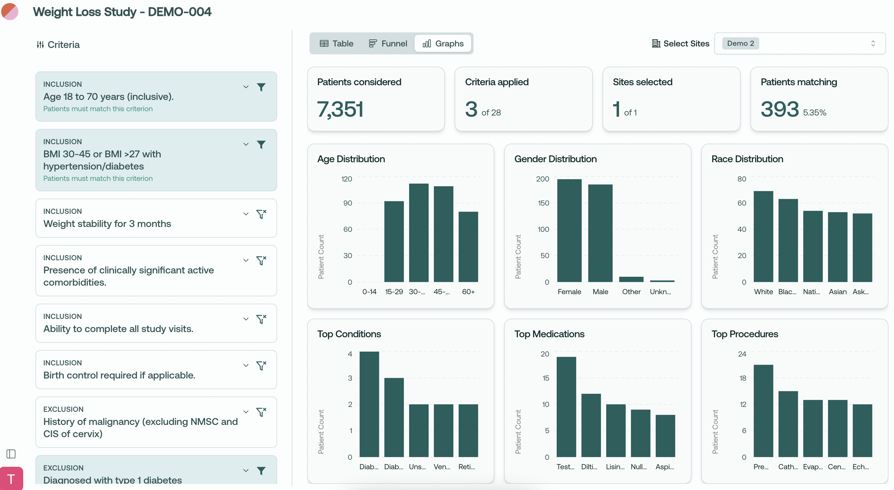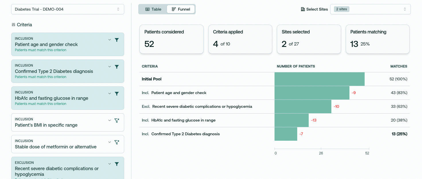 Watch your patient population flow through each criterion with real-time metrics showing the impact on your eligible pool.